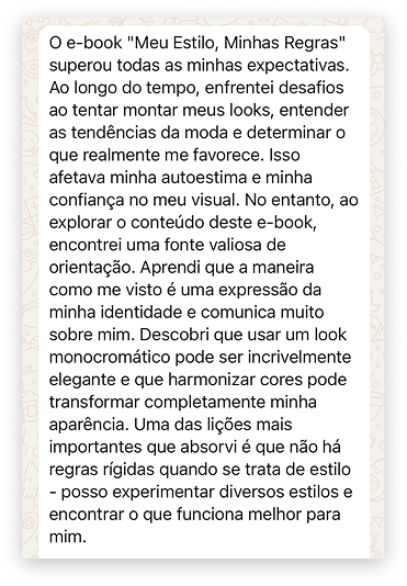 Comecei minha trajetória nos polos industriais, acompanhando o processo criativo e produtivo de perto. Trabalhei como assistente de estilo na Casa dos Criadores, vivendo a moda autoral e entendendo como a imagem constrói narrativas. Empreendi, abri minha própria fábrica, criei coleções, liderei produção e desenvolvi uma visão estratégica da moda como negócio. Depois, atuei como estilista em uma boutique infantil de alto padrão — onde refinei meu olhar para o luxo e aprendi que sofisticação está nos detalhes: nos materiais, na construção, na experiência. Mas foi ao viver minhas próprias transformações — maternidade, mudança de país, novas fases — que entendi algo ainda mais profundo: A imagem precisa evoluir com a mulher. Hoje vivo no Canadá e continuo conectando moda, estratégia e realidade para mulheres que desejam se posicionar melhor sem perder sua essência.
